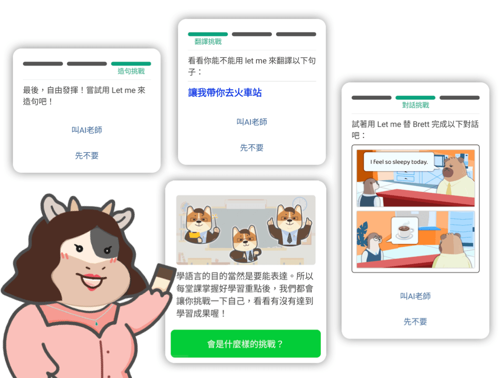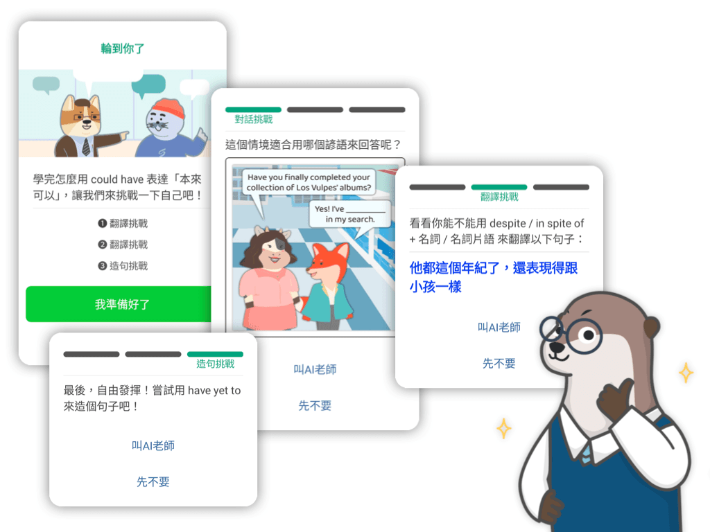我們的翻譯挑戰、對話挑戰、自由造句、口說挑戰,跳出標準答案的框框,訓練你能充滿自信一句一句把道地英文說出口!
