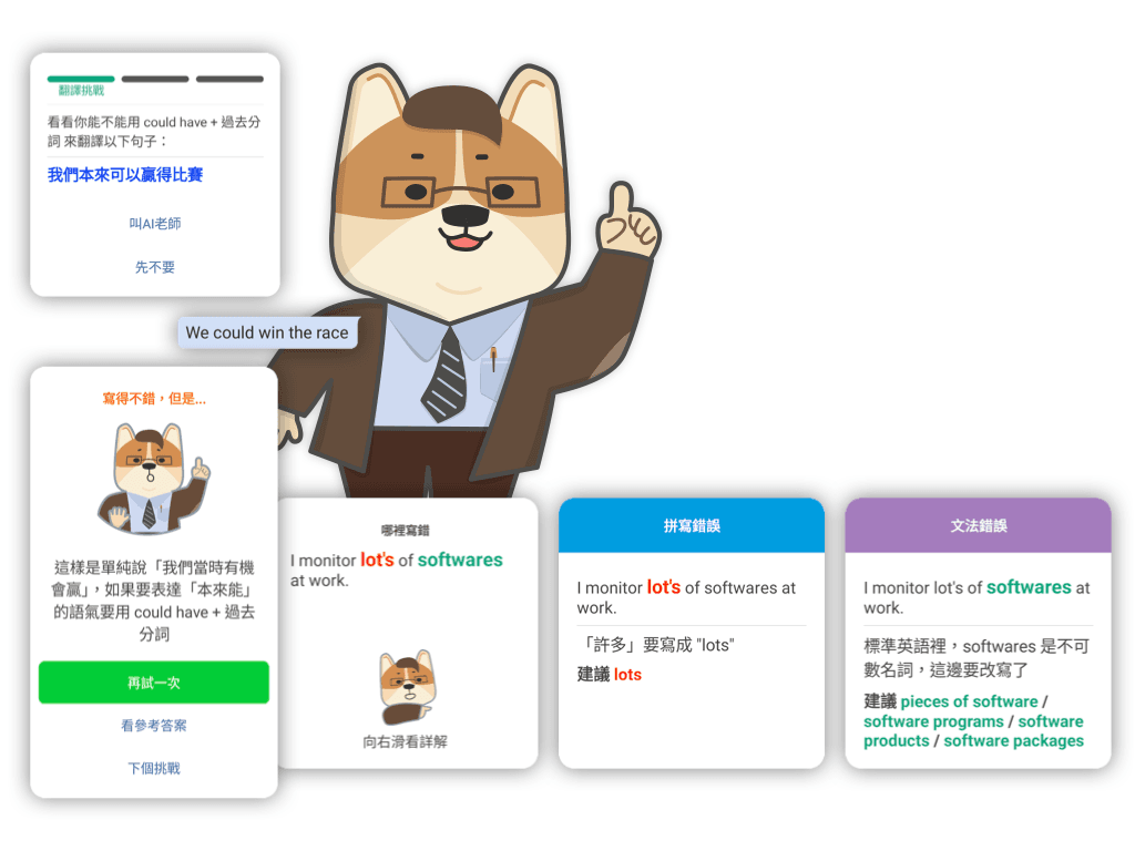 我們的 Albert AI 會即時分析你的句子,針對大家常犯的錯誤,用顯淺易懂的文字,解釋文法和拼寫錯誤,並提供糾正建議!